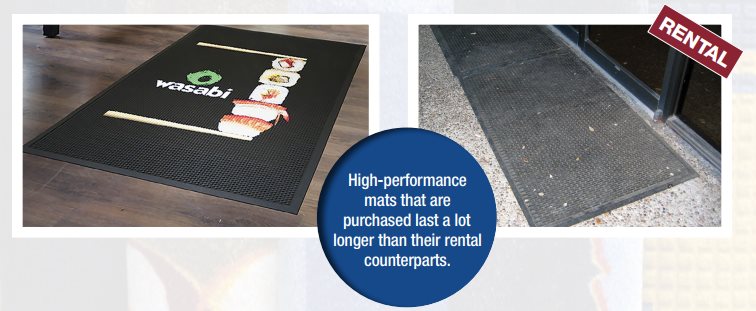 FACT: Due to frequent service intervals, mats in rental programs can vary considerably in structure and appearance with each change. This can result in subpar appearance and safely hazards. Buying mat will ensure that a high-quality image is used and your customer's brand looks good for years to come.