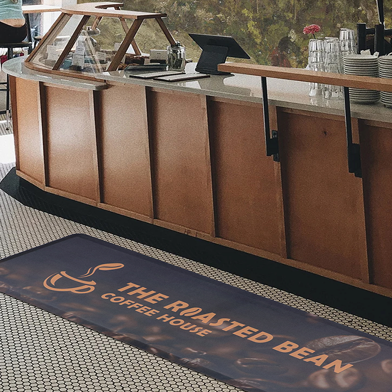 Vibrant digital color on recycled PET surface. Nitrile rubber backing stays flat; easy to clean. Perfect for reception, offices, and retail spaces.