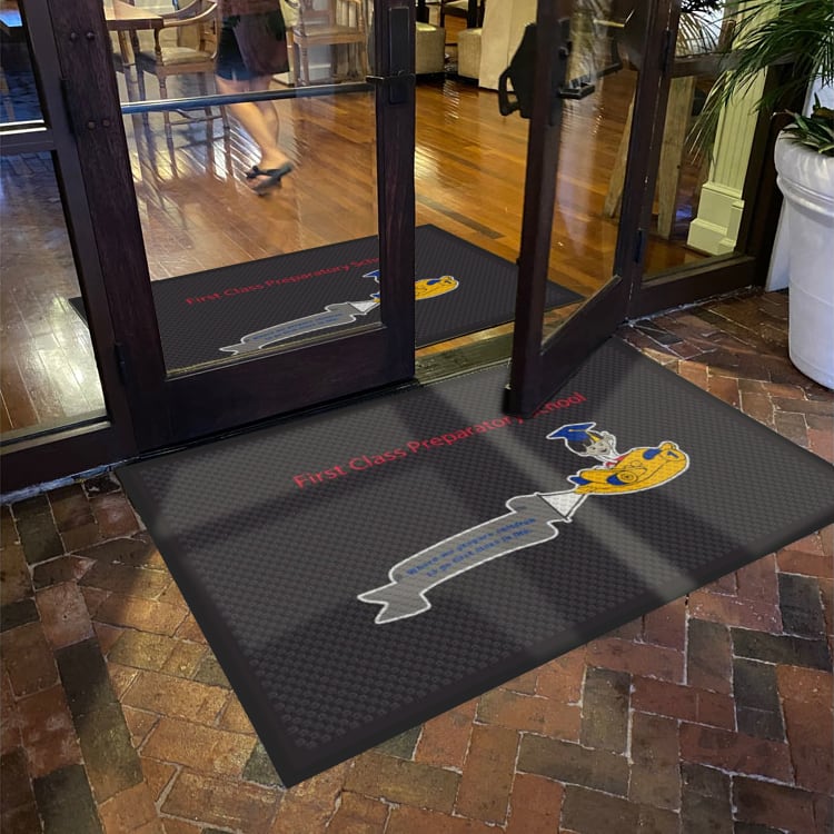 A digital print on polymetric film allows customers to customize the Rubber Scraper mat with logos, images, and messages.